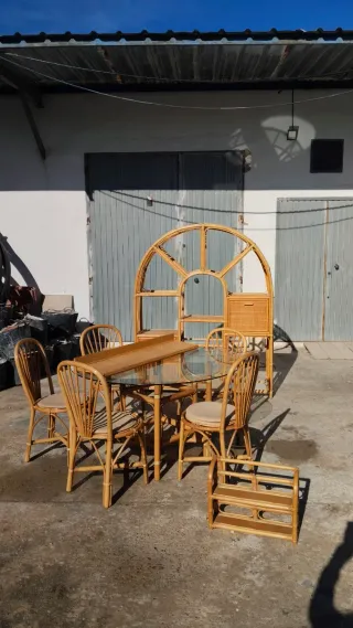 Elegante conjunto de muebles de bambú , incluye: - Estructura de bambú. - Mesa de cristal. - Incluye 5 sillas de bambú con cojines. - 2 Estantería de bambú a juego. Medidas : Mueble de bambú: Alto: 186 cm Grosor: 40 cm Largo: 147 cm Mesa: Alto: 76 cm Lado: 59 cm Vidrio: 130 cm a la redonda Estantería larga: Largo: 120 cm Grosor: 29 cm Estantería pequeña: Largo: 50 cm Grosor: 15 cm Alto: 39 cm Ubicado en el puerto de Santa María Precio totalmente negociable Precio por lote / se puede vender separado Si te interesan más cosas no dudes en visitar mi perfil