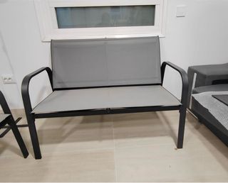 Conjunto de muebles de exterior en muy buen estado. Incluye: – Sofá de 2 plazas – 2 sillones individuales – Mesa de centro con cristal Estructura metálica resistente y asientos de textilene gris, cómodos y fáciles de limpiar. Ideal para terraza, balcón, jardín o porche. Se vende por cambio de decoración. Se vende el conjunto completo. Recogida en mano.