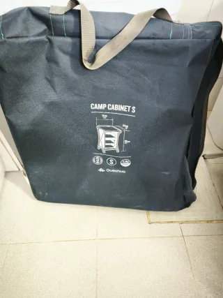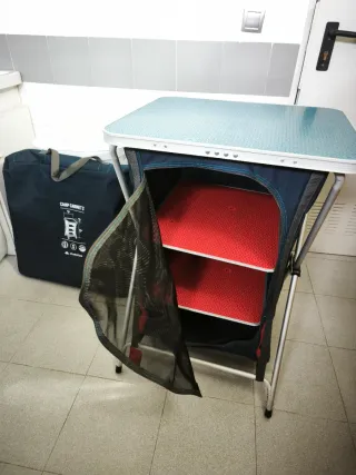 Mueble de cocina plegable para camping, modelo Cabinet S de Decathlon. Ideal para organizar tus utensilios y alimentos en tus salidas al aire libre. - Estructura de metal resistente. - Tejido de tela duradero. - Estantes interiores de color rojo. - Puerta de malla negra con cremallera. - Peso 5,3kg - Medidas en la foto