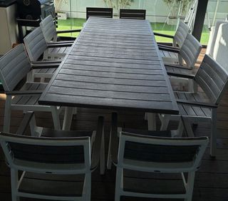 Mesa de comedor para exterior con capacidad para 10 personas. Su diseño moderno se adapta a cualquier terraza o jardín. - Mesa extensible. 160/240 - Estructura de metal y plástico.