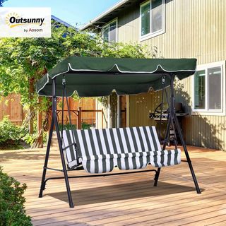 El columpio de jardín Outsunny es ideal para 3 personas, perfecto para relajarse al aire libre. Fabricado en acero recubierto de polvo, ofrece estabilidad y resistencia, soportando hasta 200 kg. El cojín de poliéster es cómodo y duradero. Dimensiones generales: 172L x 110P x 153A cm; dimensiones del asiento: 130L x 44P x 48A cm. Equipado con un techo parasol regulable para protegerte del sol. Montaje requerido. El paquete incluye: 1 columpio de 3 plazas y manual. Colores disponibles: verde oscuro y blanco. Decora tus espacios exteriores con estilo y confort.