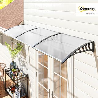 El toldo para exteriores Outsunny ofrece protección contra la lluvia y el sol, fabricado con paneles de policarbonato hueco de 5 mm, no tóxicos y resistentes. Dimensiones: 90L x 295P x 23.5A cm. Incluye soportes de plástico rígido PP y perfiles de aluminio para una fijación segura. El recubrimiento anti-UV previene el sobrecalentamiento estival. Fácil de montar con todos los accesorios incluidos. Resistente a las inclemencias del tiempo, puede permanecer al aire libre todo el año sin deteriorarse. Color: tela transparente y soporte negro. Montaje requerido para una instalación estable y duradera.