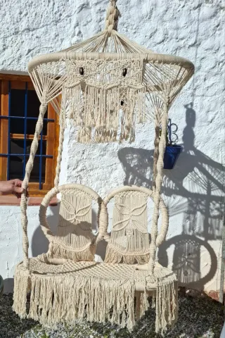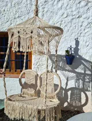 Conjunto de asiento y mesa de cuerda para exterior. Ideal para darle un toque bohemio a tu jardín o terraza. La mesa no tiene cristal y tiene una manchita - Diseño artesanal con cuerdas de buena calidad. - Acabado en color beige natural.