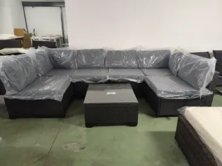 Conjunto de muebles de exterior en color gris, perfecto para tu terraza o jardín. Incluye un sofá modular y una mesa. - Estructura de poliratán. - Mesa con tapa de cristal. - Nuevo a estrenar. - Medidas: 275x140x66