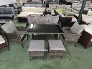 Conjunto de mobiliario de exterior, ideal para tu terraza o jardín. Este set está listo para estrenar. - Mesa con superficie de cristal. - Estructura de ratán de sintético - Cojines incluidos. -Resistente al clima - Se lo pueden llevar en su caja MEDIDAS *sofá de 3 plazas Ancho 158 cm Alto 75 cm Fondo 50 cm *Sillones Alto 75 cm Fondo 50 cm Ancho 57 cm *PUF Alto 48 cm Ancho 40 cm Fondo 40 cm *Mesa Alto 70 cm Ancho 120 cm Fondo 70 cm