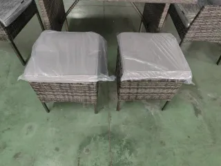 Conjunto de muebles de exterior nuevo a estrenar, perfecto para tu terraza o jardín. Incluye sofá, mesa y dos taburetes. - Estructura de ratán. - Mesa con tapa de cristal. - Cojines blancos incluidos.