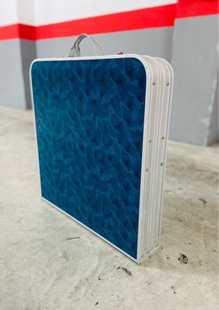 Conjunto de mesa y sillas plegables de Decathlon, ideal para camping o playa. Fácil de transportar y almacenar. - Diseño con estampado azul. - Estructura metálica plateada.