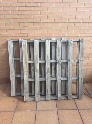 Se venden dos palets de madera para exterior con juego de cojines. Son ideales para proyectos de bricolaje o decoración. Están en buen estado. Los cojines están sin estrenar. el conjunto está formado por un cojín de asiento (120x80cm), otro de respaldo (120x50cm) y dos cojines pequeños de apoya brazos (50x30cm). Los palets son de 105x105cm