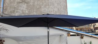 Sombrilla rectangular de 3x2 metros, 2,50 altura. Manivela para subir y bajar. Se puede girar. Esta como nueva se compro el año pasado. La vendo completa con pie peso de 30 kilos. Solo venta en persona, no se hacen envios.