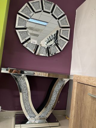 Elegante consola de estilo glam con un espejo a juego. Un conjunto que aportará un toque de lujo a tu hogar. - Diseño moderno y sofisticado. - Acabado brillante y detalles en piedra. - Ideal para recibidores o salones. La consola mide 110 × 35 × 75 de alto El espejo 97 cm diametro El precio es de la consola solamente 173 € El espejo vale 134 € Puedes pagarlo en casa contrareembolso? X 25€
