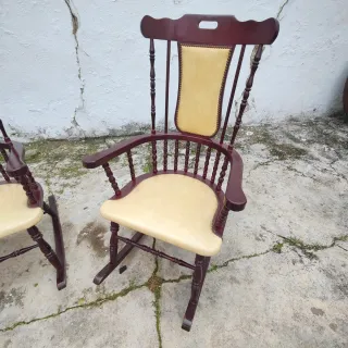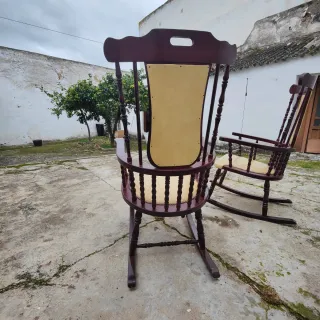 Se vende exclusiva pareja de mecedoras clásicas en madera maciza de color caoba. Una oportunidad única para adquirir dos piezas elegantes, robustas y en un estado de conservación excelente. Acabados de calidad: Tapicería original en color crema con detalle perimetral de tachuelas doradas/metálicas. Comodidad: Respaldo alto ergonómico con asa superior para fácil transporte. Dimensiones: 104 cm (alto) x 59 cm (ancho) x 74 cm (fondo). Estado: Estructura muy firme, balanceo perfecto. No sé hacen envios