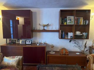 Conjunto de muebles para salón, incluye una mesa grande extensible, una mesa pequeña y cuatro sillas, lámparas de techo dos y pie de lámpara y dos apliques todo a juego los muebles van por módulos se adaptan mueble tv, vitrina y estantería he puesto medidas orientativas se me olvidó una estantería que va encima de la tele decorativa si quieres venir a verlos sin compromiso están de lujo y precio negociable medias mueble tv 1'20 vitrina 1.20 estantería 60 mesa grande 1.20 x 90 extensible y pequeña 95x60 - Mesa grande de madera. - Mesa pequeña de madera. - Cuatro sillas a juego.