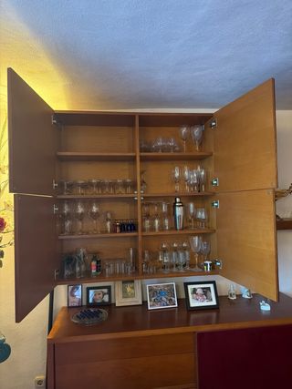 Muebles de salón comedor de lujo con un diseño moderno y elegante. Combina a la perfección la calidez de la madera con el brillo del cristal. Comprado 4500€ Hay 4 muebles en el conjunto mas una estancia - Acabado en tonos marrones y rojos. - Estructura principal de madera. - Detalles en cristal.