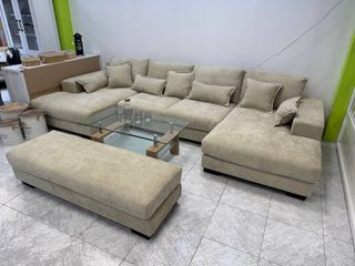 Sofá en forma de U de gran tamaño, con un acabado suave y agradable al tacto. Tela "nubuck" similar al terciopelo - Diseño moderno y espacioso. - Tapicería de alta calidad. Medidas Largo total: 415 cm Lado derecho: 360 cm Chaise longue: 184 x 115 cm Carro sofa abierto 1m cerrado 60 cm Canapé con arcon almacenaje ✨ Características: Totalmente desenfundable (asientos y respaldos) Asientos amplios y confortables Tejido fácil de limpiar