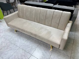 Sofá cama con diseño de lujo, tapizado en terciopelo beige muy suave. Patas metálicas en tono dorado que aportan distinción. Se convierte en cama con un solo movimiento. Producto 100% nuevo. Se entrega en su embalaje de fábrica. Elegancia y confort. 📲 639*116*436 - Judith ☎️ ✅Pagos y envios a contra - rembolso ✅ ✅Envios de 1 a 4 dias. ✅ ✅Envio de factura. ✅ ✅Garantia de 2 años.✅ ✅Productos completamente Nuevos ✅ ☎️ Tienes dudas? , no dudes en comunicarte con nosotros, atendemos 24HRS.☎️