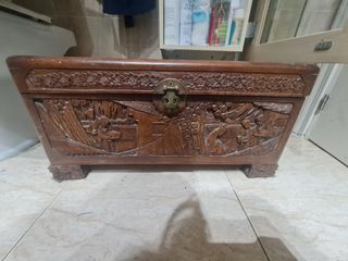 Antiguo baúl madera maciza artesanalmente tallado Placa autenticidad: Golden Dragon Co.. Wood Carved Factory Shangai China (Fábrica de tallados en madera, especialistas en artículos de lujo y muebles)