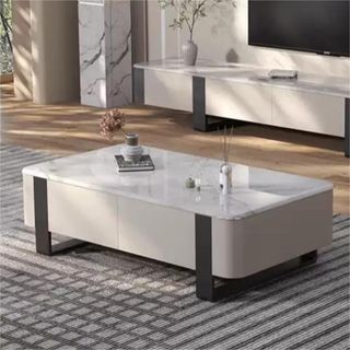 Mesa de centro rectangular de lujo moderno con superficie de porcelánico White Fish Belly brillante y base de titanio negro dorado, con cajones, modelo MC-C-47, 1.3M TIENDA FISICA SITUADA Badalona, Barcelona +34 678859596 Ciro