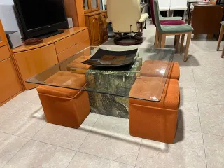 Conjunto de mesa baja con superficie de cristal y cuatro pufs. - Base de la mesa con diseño de piedra veteada. - Pufs tapizados en tela naranja. hogar que busque un toque de elegancia. *Mesa de Centro de Lujo - En Buen Estado* mesa de centro de lujo para salón, perfecta para decorar y disfrutar de momentos con familia y amigos. - *Medidas*: 1m de ancho / 1m de largo / 42 cm de altura - *Estructura*: Mármol - *Tablero*: Cristal de gran resistencia - *Incluye*: 4 taburetes de tela - *Precio*: 140€ OFRECEMOS ENVIO A CASA