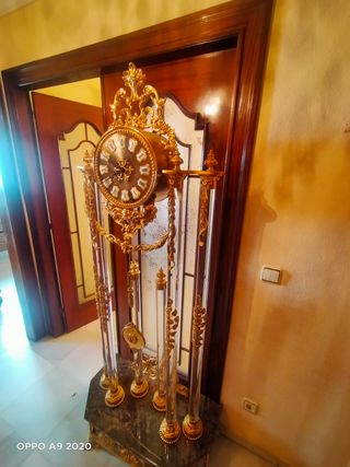 Elegante reloj de pie estilo Luis XV, una pieza de lujo para el hogar. - Estructura principal en bronce dorado. - Base de mármol con vetas. - Columnas de metraquilato transparente. - Detalles ornamentales dorados.