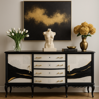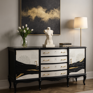 Medidas 184 x 56 x 94 DESCUENTO ESPECIAL Hermoso aparador isabelino de los años 50, restaurado por DKP, con un enfoque moderno que resalta su elegancia y singularidad. Las formas geométricas talladas en la fachada son completamente artesanales, y el uso de pan de oro se eligió para complementar los tiradores artísticos dorados, añadiendo un toque de lujo. Esta restauración única convierte este aparador en un elemento decorativo exclusivo, perfecto para embellecer cualquier espacio con historia y sofisticación. C/ Antillano Campos,5 Sevilla