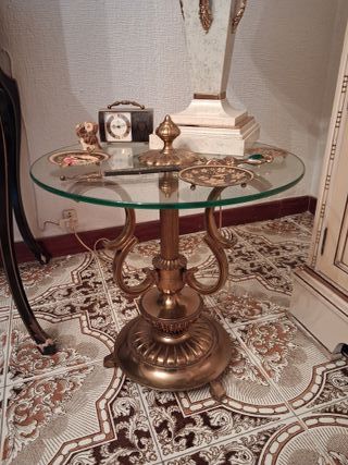Elegante mesa auxiliar de centro, tipo velador, de estilo clásico y gran calidad. Una pieza robusta y decorativa, ideal para colocar junto a un sofá o como soporte para una lámpara de época. Materiales: Sobre de cristal y estructura de bronce/latón dorado. Diseño: Pedestal central labrado con tres patas de garra decoradas con relieves artísticos. Estado: Muy bien conservada. crital sin roturas, y el metal mantiene su brillo original. Un mueble distinguido que aporta un toque de lujo clásico a cualquier estancia.
