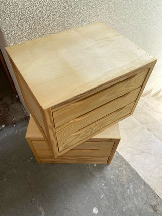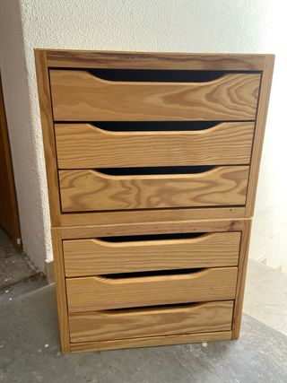 Mueble organizador con varios cajones, ideal para almacenar objetos. VALEN DE MESITAS DE NOCHE o OFICINA COMO NUEVOS MUY FUNCIONALES SE VENDEN POR SEPARADO 1 35€ 2 60€ MEDIDAS MODULO Largo 30cm Ancho 39cm MEDIDAS CAJON Largo 24cm de interior/útiles Ancho 13cm de interior/útiles - Diseño de madera con tiradores integrados. - Dos módulos apilables para mayor capacidad. (Se venden por mudanza)