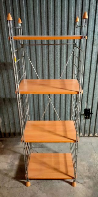 Estantería con 4 baldas de madera y costados metálicos con posibilidad de poner las lejas a la altura que se necesite. Puede servir para habitación, oficina, salón, baño, trastero o lo que cada uno desee en función de sus necesidades. Está en perfecto estado.