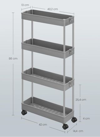 SONGMICS Carro de Almacenamiento de 4 Niveles, Carrito con Ruedas, Carro de Cocina, Ahorro de Espacio, para Baño, Oficina, 14,4 x 42 x 86 cm, Gris Paloma KSC008G01 Optimiza espacios pequeños: Diseñado para aprovechar cada centímetro, este carrito de almacenamiento delgado de 14,4 x 42 x 86 cm se adapta perfectamente a espacios estrechos en cocinas, cuartos de lavado o baños Prácticos ganchos extraíbles: Equipado con 6 ganchos ajustables que se pueden colocar en el lateral o en el frente, este versátil carro utilitario mantiene paños de cocina, cepillos o agarraderas al alcance de la mano Robusto y duradero: Este carrito de cocin...