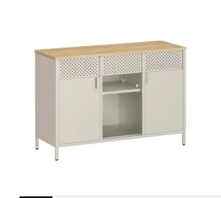 SONGMICS Armario de metal con puertas dobles y estantes ajustables Versátil: Este elegante armario, con su color clásico y diseño elegante, se integra sin esfuerzo en tu hogar y se puede utilizar como un aparador en la cocina, un mueble de TV en la sala de estar, o un armario de almacenamiento en la oficina Orficios multifuncionales: El cuerpo del armario cuenta con orificios que proporcionan una ventilación óptima y permiten colocar ganchos (no incluidos) para colgar objetos Amplio espacio y flexible: Con una encimera para cafetera o microondas, un cajón para utensilios pequeños, 2 compartimentos abiertos y estantes ajustables en