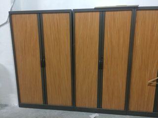 Armarios metálicos y de puertas de persiana correderas en color madera. Las baldas son también metálicas. Dispongo de 6 ud. Precio por ud.