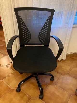 ¡Oportunidad de ahorro en Algeciras! Vendo silla de escritorio tipo ejecutiva en color negro. Es extremadamente cómoda para largas sesiones de trabajo o estudio. El pistón de gas (sube y baja) funciona suave, las ruedas giran perfecto y la estructura es sólida. No cojea. Estado estético: Tiene manchas de pintura detrás del cabecero, hay marcas en la piel sintetica, aunque son pequeñas. (ver fotos reales, aquí no ocultamos nada). ¿Por qué te interesa? Porque por este precio no encuentras esta comodidad y presencia.