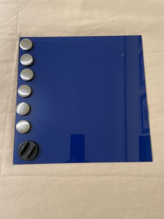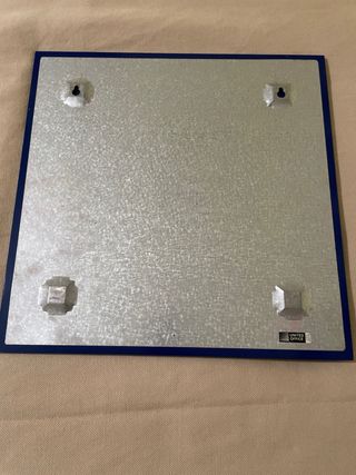 Pizarra de cristal de color azul intenso, ideal para cualquier espacio. Incluye un set de fijaciones para su montaje. - 6 imanes - 1 portarotulador - 35 x 35 - Se ven las marcas por donde ha estado colgada pero no interfiere para nada su uso