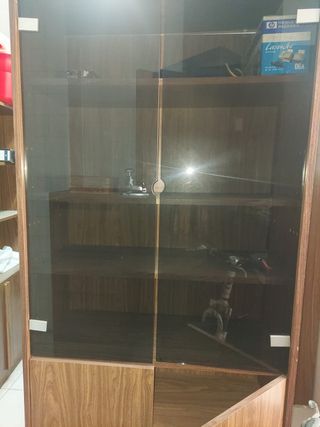 Mueble de almacenaje de madera con parte superior en cristal tintado. Ancho 79cm, fondo 45cm y altura 145cm.