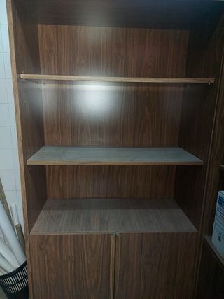Estantería de madera con puerta y varios compartimentos. Medidas 68 cm de ancho, 40 cm de profundo y 220 cm de alto. Tengo más muebles de oficina disponibles, para más información contactar