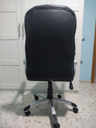 Se vende silla de oficina giratoria. Es de color negro y está en buen estado, aunque presenta algunas señales de uso que son subsanables. - Estructura de plástico resistente. - Tapizado de cuero sintético. - Cinco ruedas para facilitar el movimiento y en perfecto estado y funcionamiento.