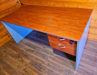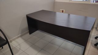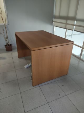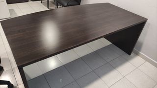Escritorio de oficina espaciosa y sólida. Es prácticamente idéntica a la del anuncio anterior. - Superficie de madera con acabado en tono marrón cálido. - Base robusta en color negro.