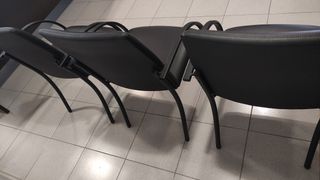 Conjunto de tres sillas de oficina con un diseño moderno y cómodo. Han sido recién tapizadas para darles una nueva vida. 20€ cada una - Tapicería en tela color beige. - Estructura metálica negra.