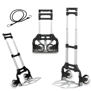 Carrito plegable de transporte, ligero y resistente, ideal para mudanzas, compras, oficinas o viajes. Fabricado en aluminio y plástico reforzado. Medidas abierto: 100 × 39 × 40 cm; plegado: 63 × 39 × 5 cm, muy compacto para guardar. Plataforma de carga de 39 × 28 cm. Ruedas de goma de 12 cm de diámetro para un desplazamiento suave y silencioso. Mango telescópico con 3 alturas ajustables. Peso aproximado del carro: 2,7 kg. Carga máxima recomendada: 80 kg. Incluye pulpos elásticos para sujeción segura de bultos. Perfecto para transportar cajas, maletas y paquetes sin esfuerzo. REF 10958921