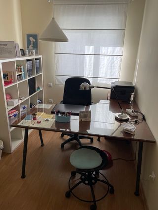Conjunto de mobiliario para despacho con superficie de cristal y estructura de madera. - Diseño moderno y funcional. - Patas metálicas robustas. - Estantería blanca auxiliar. - Silla de oficina con ruedas. - Silla con ruedas sin respaldo - Cajonera - Vade y flexo - Lámpara
