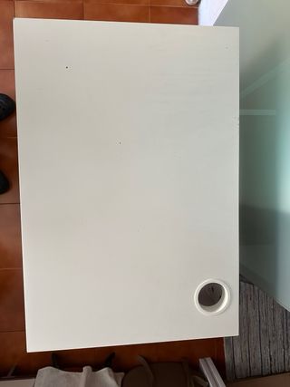 Escritorio de diseño moderno y funcional de color blanco - Medidas: 105 cm de ancho x 50 cm de profundidad. - Color blanco. - Incluye un cajón. - Orificio para pasar cables. Tiene señales de uso y le falta el estante del armario.
