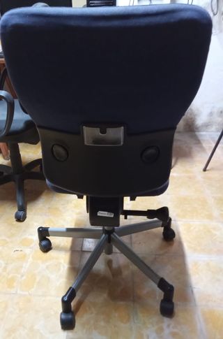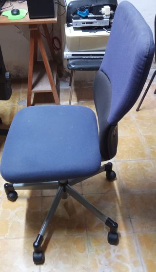 Silla de oficina cómoda y funcional. - Asiento y respaldo tapizados en tela. - Base de plástico con ruedas. - Reposabrazos ergonómicos. Solo hay que quitarle el polvo y limpiarla.