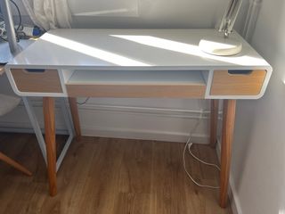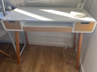 Elegante escritorio de Ikea, con un diseño moderno y funcional. Se encuentra en perfecto estado. - Combinación de colores blanco y madera. - Patas de madera con estructura metálica. - Cajones integrados para almacenamiento.