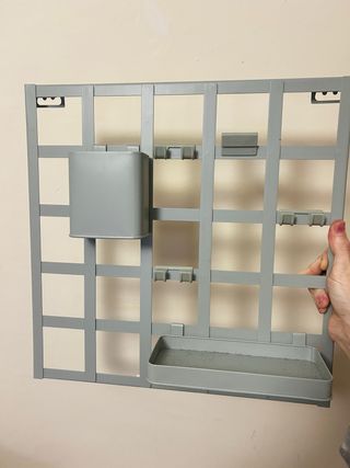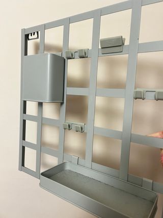 Tablero organizador de pared con accesorios. - Incluye cubilete, bandeja y ganchos. - Diseño modular para adaptar a tus necesidades. - Ideal para organizar herramientas o material de manualidades.