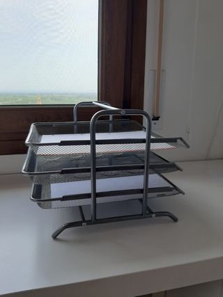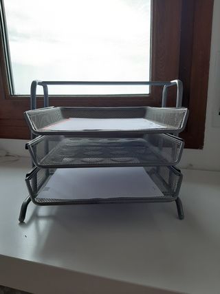 De metal color gris, ideal para escritorio, oficina, recepción etc. Tener los documentos a la vista y localizados facilita el trabajo, y dos cubiletes para los bolígrafos, lápices, etc . En buen estado