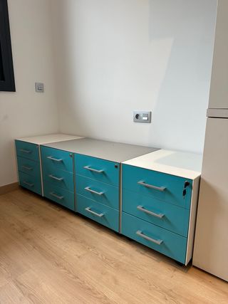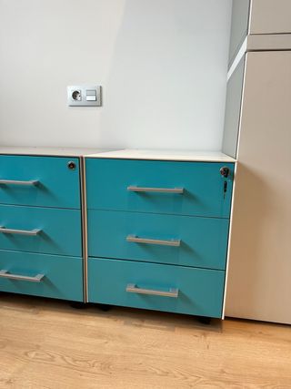 Cajoneras metalicas con ruedas de la marca Ofiprix. Una blanca y azul y dos gris y azul. 150€ por unidad. Quedan 2 unidades