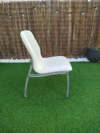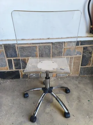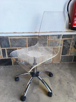 Silla de oficina con un diseño moderno y ligero. - Asiento y respaldo de acrílico transparente. - Base de metal cromado con ruedas. - Mecanismo de ajuste de altura.