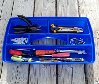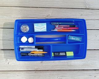 Bandeja ordenada portátil para organizar productos como en una guardería de educación temprana (ordenar y guardar lápices), herramientas, etc🪛🔧🔨🖍️🖊️🖋️ Es de plástico de color azul, con cinco compartimentos multiusos, y con asa para su mejor transporte. Sus medidas son 37x 21 cm. y 6,5 cm. de alta.