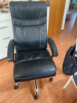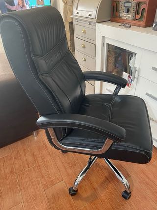 Silla de oficina con un diseño moderno y ergonómico. - Base de metal con ruedas. - Tapizado en piel sintética. Ver ultima foto donde tiene un poco roto por lo demás está en muy buen estado.