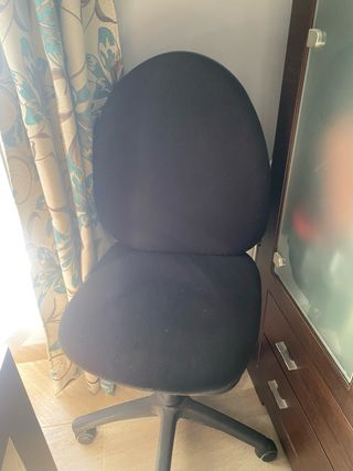 Silla de ordenador de color negro, con estructura metálica y asiento de tela. Es una silla giratoria con ruedas. -Tiene reposabrazos. -El asiento parece cómodo y resistente. -Está en buen estado, aunque presenta algunas señales de uso.