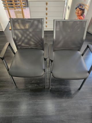 Sillas con reposabrazos. Respaldo de rejilla. Patas metal. Tenemos 6 unidades. En buen estado. Color gris. Precio por unidad
